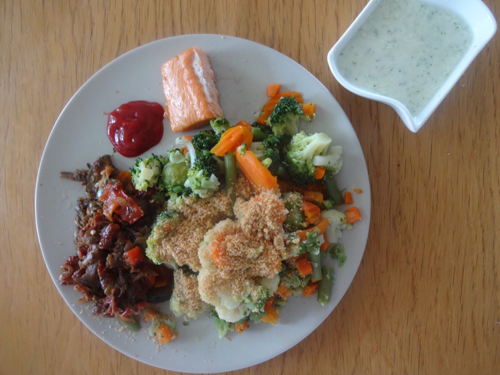 misz-masz: kalafior z bułą, warzywa na parze, leczo, kawałek łososia, tzatziki